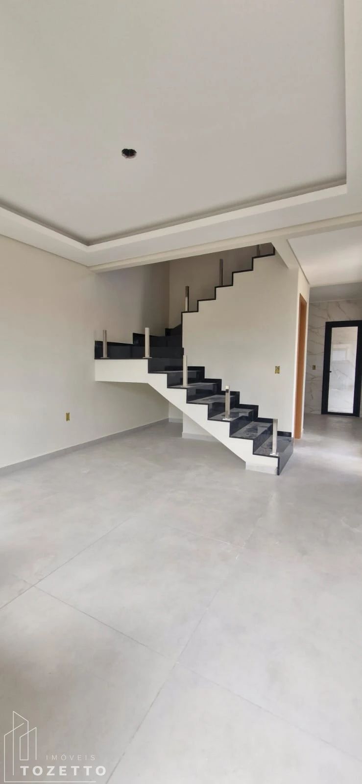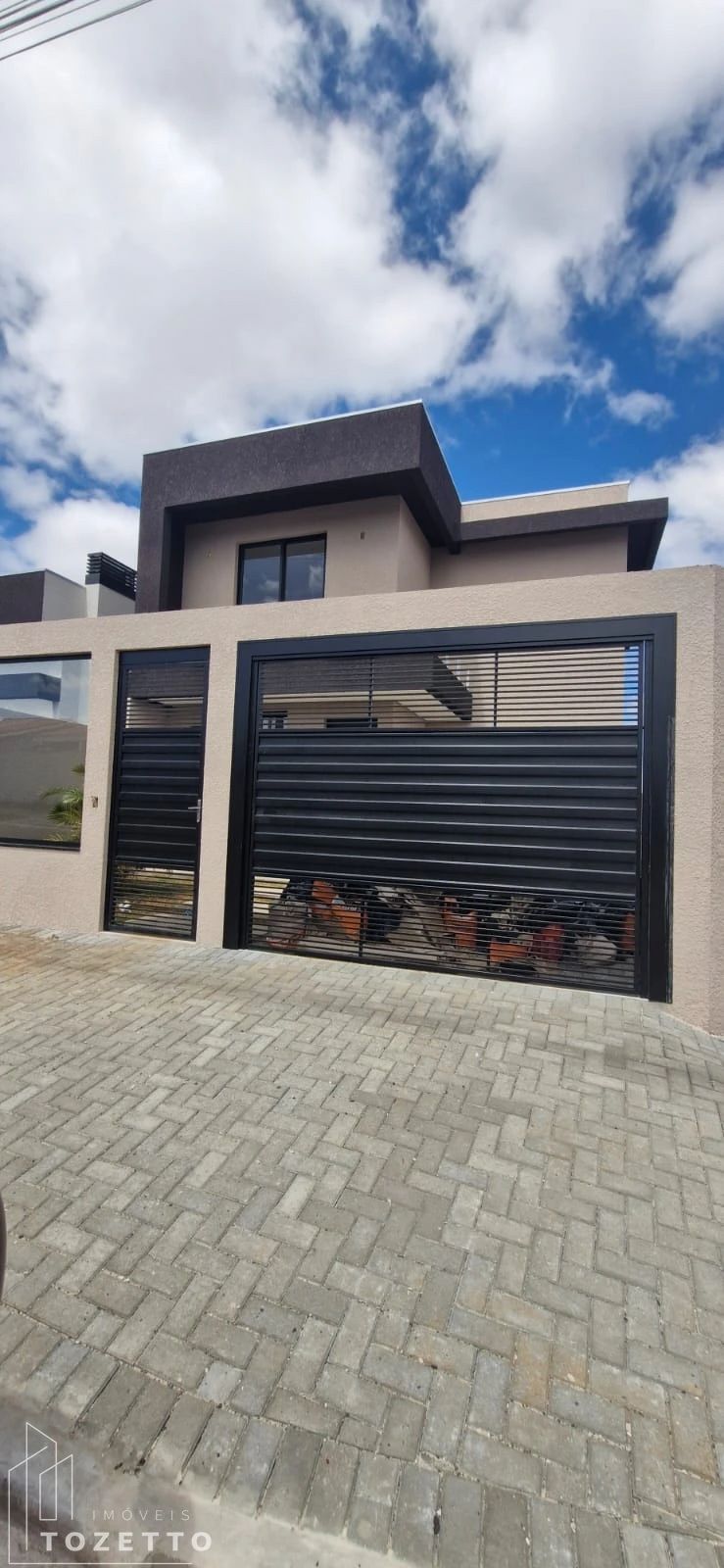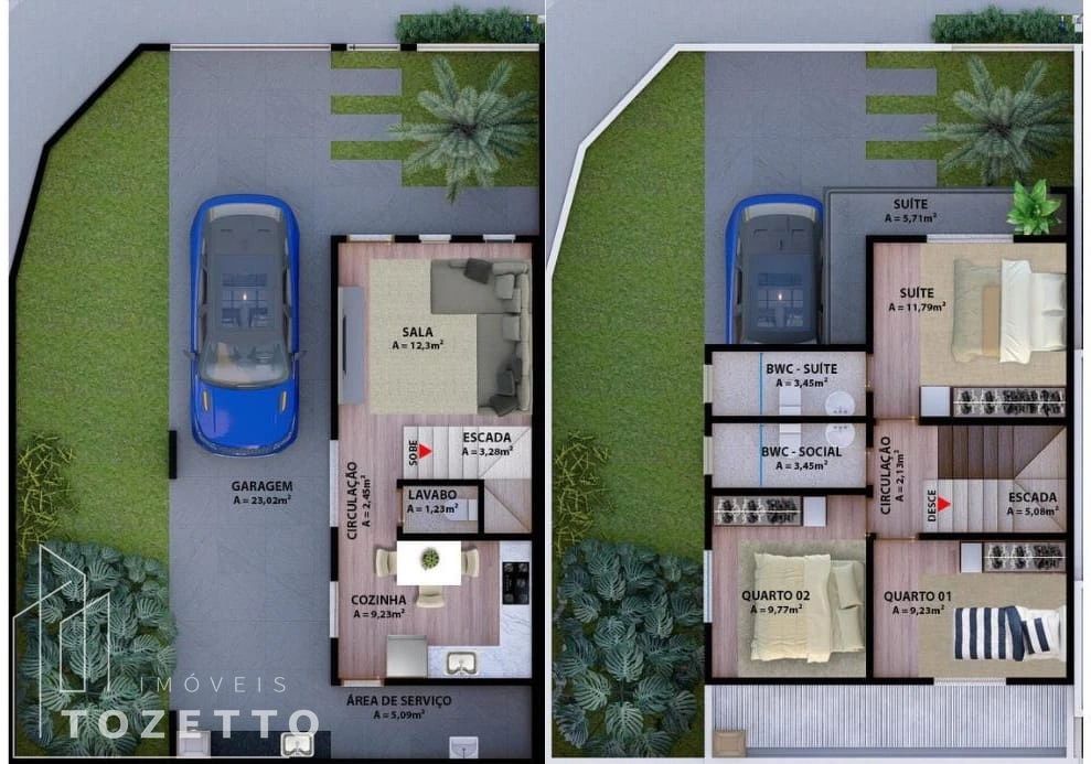 Andar inferior:Sala, lavabo, cozinha individual, área de serviços coberta integrada com espaço gourmet e garagem coberta;